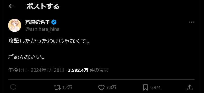 その後、1月28日は芦原妃名子「攻撃したかったわけじゃなくて。ごめんなさい」とポストが最後となりました。